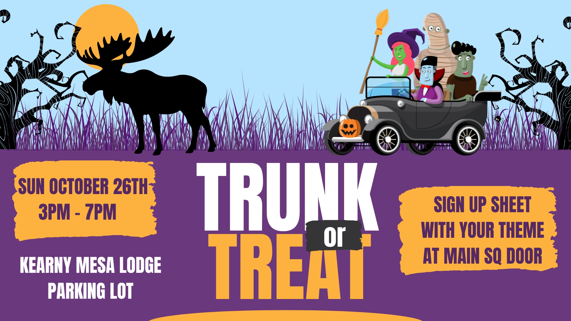 TRUNK-OR-TREAT! Look for the vehicle sign-up sheet in the Social Quarters. Karaoke with Patrick Hill 3pm - close.