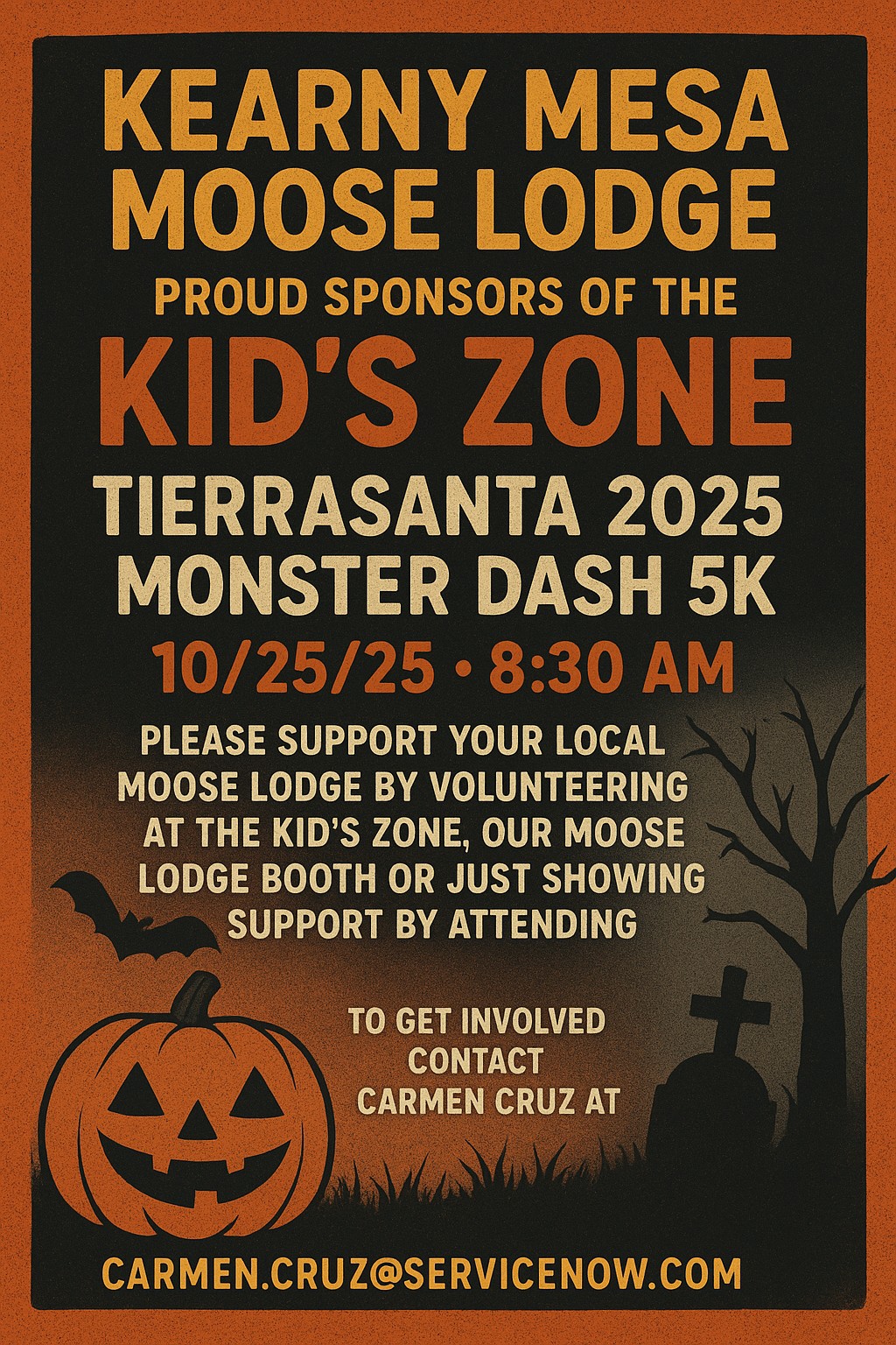 🎉 Exciting news! The Kearny Mesa Moose Lodge #1852 is proud to sponsor the Kid Zone at the annual Tierrasanta Monster Dash 5K on October 25, 2025—fun for the whole family! 🏃♂️👻🎈 We’re also looking for volunteers to help run our booth that day—come join the fun! Free to attend the vendor fair, but please consider registering! Let's get out in our community and represent the Moose! Funds raised will go towards fixing a trailer at a local fire station where EMTs reside while on duty. It is in desperate need of our help! Two event types to choose from! 5K Measured Race ($40) or 5K Fun Run & Walk ($30). Perks for All Paid Entrants: Souvenir Monster Dash T-shirt, Entry to the Free Beer Garden (21+ with ID & bib), Free pizza from a local restaurant, Finisher medals for all.