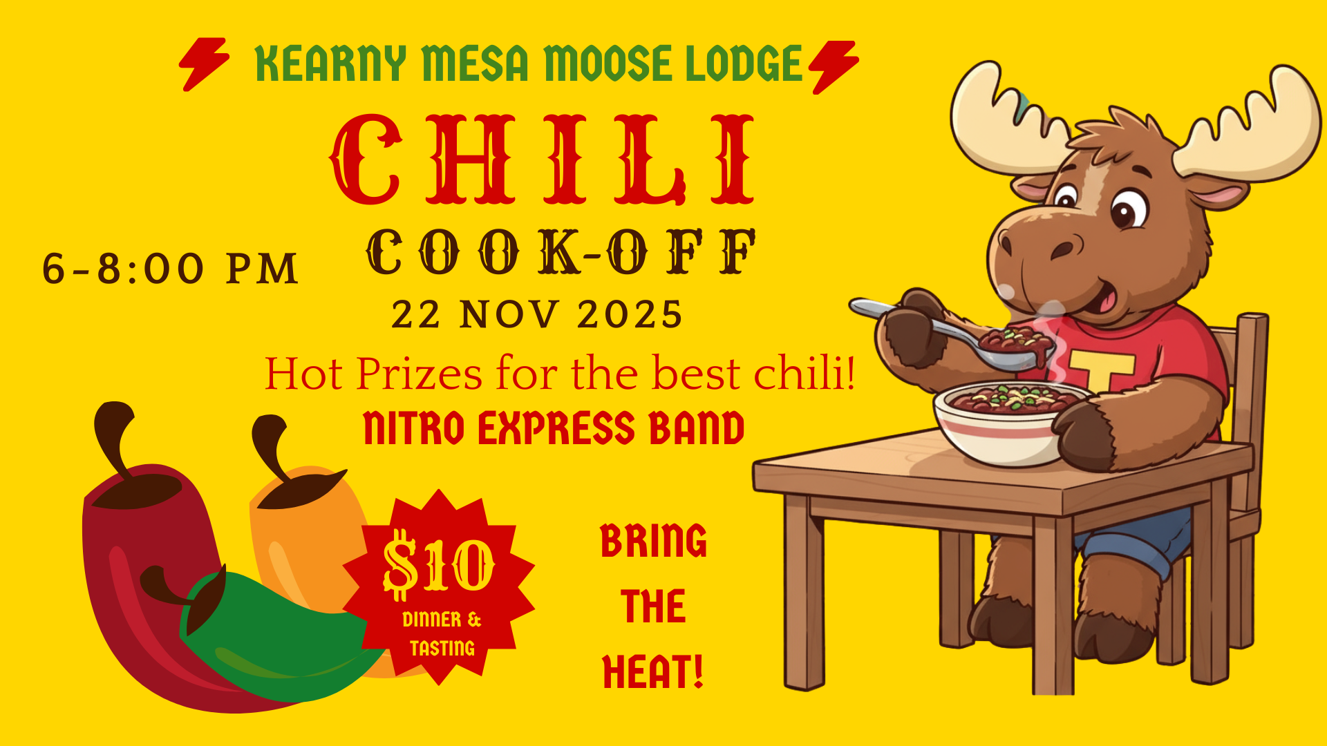 Kearny Mesa's famous CHILI COOK-OFF! $20 to enter, with cash prizes of 70% - 20% - 10% of the total entry fees. $10 dinner and tasting. Contestants eat free! Live music 7 to 10pm by Nitro Express! RSVP to Tony 858-336-2470 for entrants and dinner. Contestants should include a list of ingredients (don't write your name on it, though!).